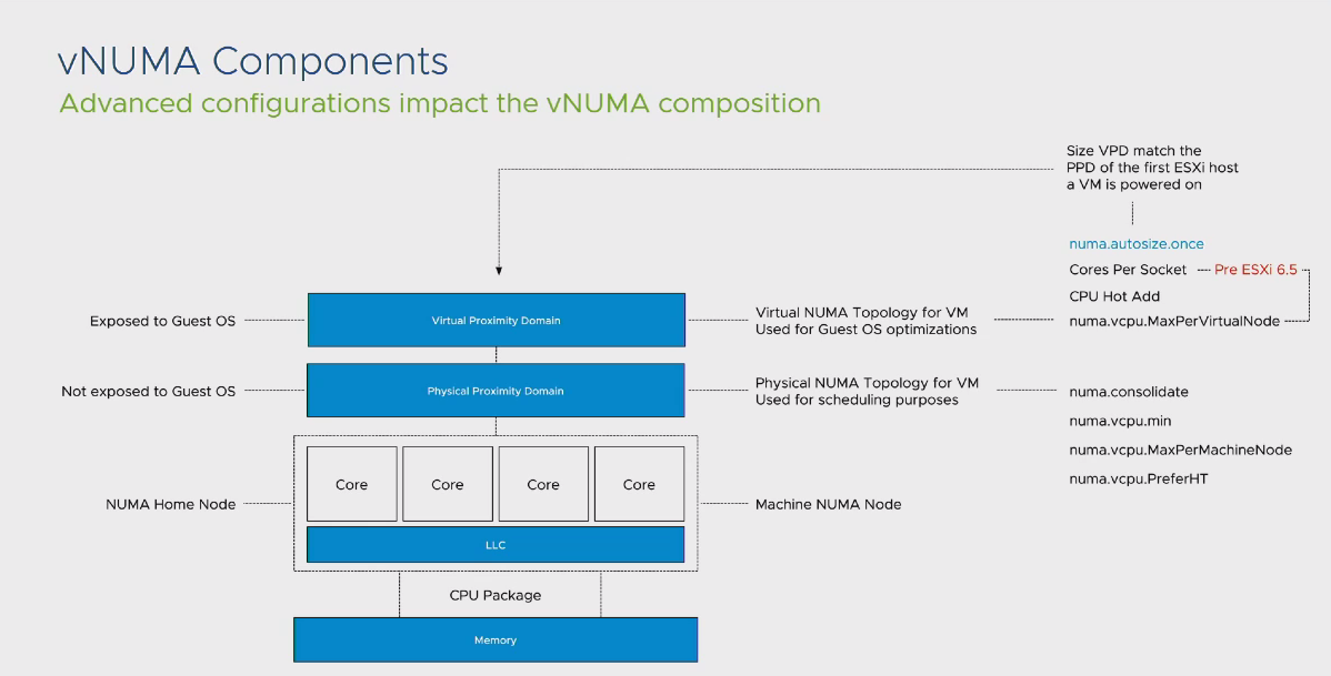 زمانیکه صحبت از NUMA در محیط مجازی می کنیم، باید در نهایت به این نتیجه برسیم که Guest OS نصب شده بر روی ماشین مجازی از اینکه از NUMA می تواند بهره برداری کند یا خیر آگاه باشد. این آگاهی توسط بخشی به نام VPD به سیستم عامل مجازی ما Expose می شود. در لایه پایین تر، هر VPD به یک PPD به اصطلاح MAP شده تا در نهایت توسط CPU Scheduler فرآیند تخصیص هسته های فیزیکی به vCPU های این ماشین مجازی انجام شود. طبق تصویر بالا، می توانید تنظیمات تاثیرگذار در هر بخش را نیز مشاهده نمایید.